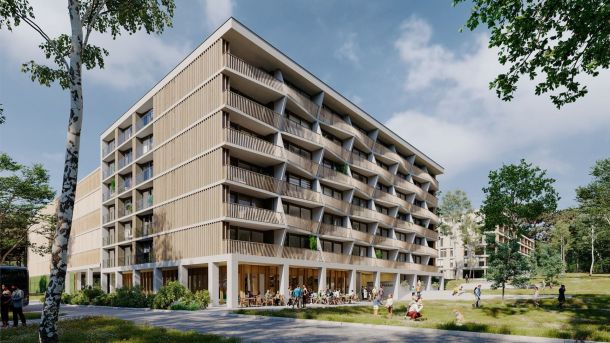 Het hoogste punt van het appartementencomplex World Food Center Veld G in Ede is bereikt. Daarvan zijn een kleine negentig sociale huurwoningen.