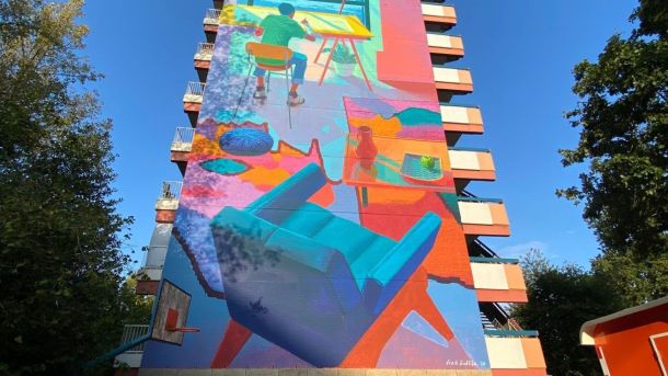 Aan de zijkant van de flat Groot Derxsgoed in Ede-Zuid werd woensdag een enorme muurschildering onthuld. Samen met de Gemeente Ede, Astrant, Mauritshuis en het Kröller-Müller Museum vond de opening plaats.