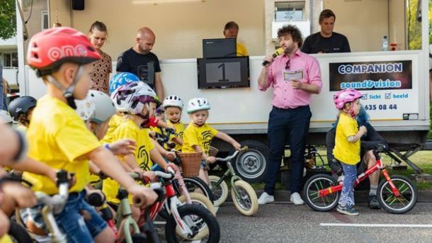 Wethouder Rik Dekker geeft startsein voor Wielerronde Woudenberg