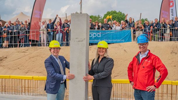 De start van de bouw van 87 appartementen op de voormalige atletiekbaan in Ede is een feit. Woensdag werd de eerste betonkolom feestelijk geplaatst.