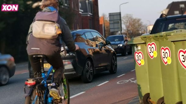 Een groep bewoners van de Rhenense Herenstraat (N225) is het gescheur voor de deur zat en plakken 30km-stickers op hun afvalcontainers.