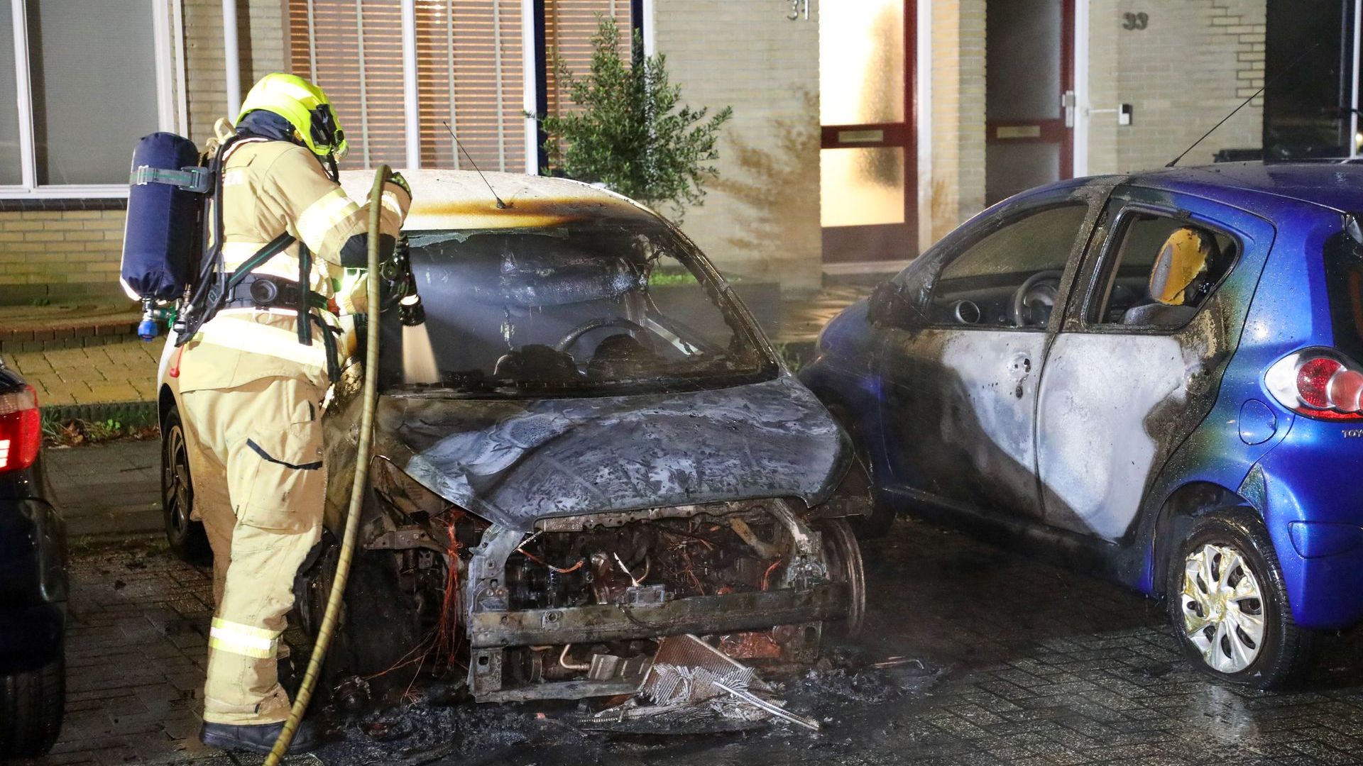 Bij aankomst van de brandweer stonden twee auto’s in de brand. Een derde auto liep lichte schade op. Met een speciale bluslans had de brandweer de brand snel onder controle, maar beiden auto’s liepen veel schade op.