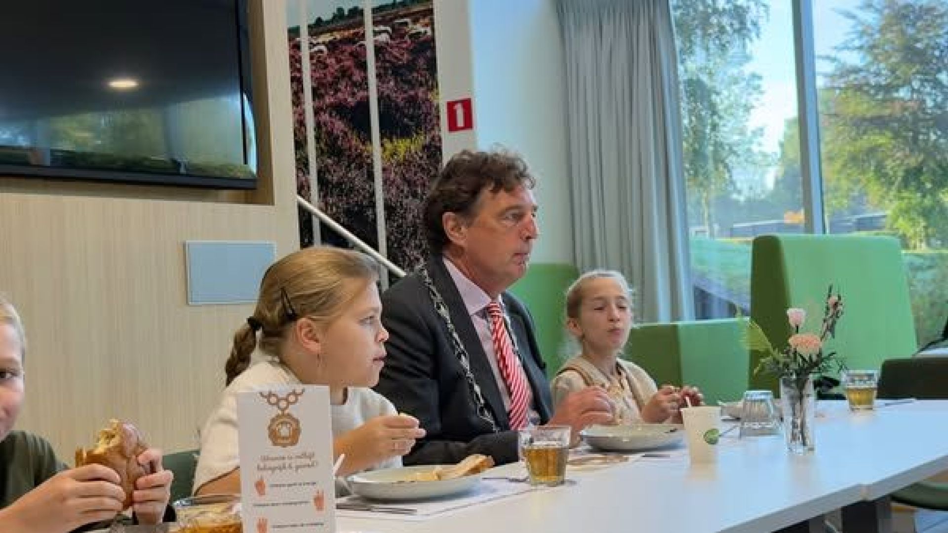 Voor deze ene keer was praten met een volle mond toegestaan. De kinderen en de burgemeester praatten samen over hoe belangrijk een gezond ontbijt is. Bijvoorbeeld om goed op te kunnen letten op school. En om moeilijke sommen te maken tijdens de rekenles. Twee boerinnen uit Lunteren brachten eten mee. De kinderen proefden van vers brood, yoghurt en eitjes. Hier en daar werd er zelfs aan een walnoot geknabbeld. De boerinnen legden de nieuwsgierige kinderen uit waar ons eten vandaan komt.