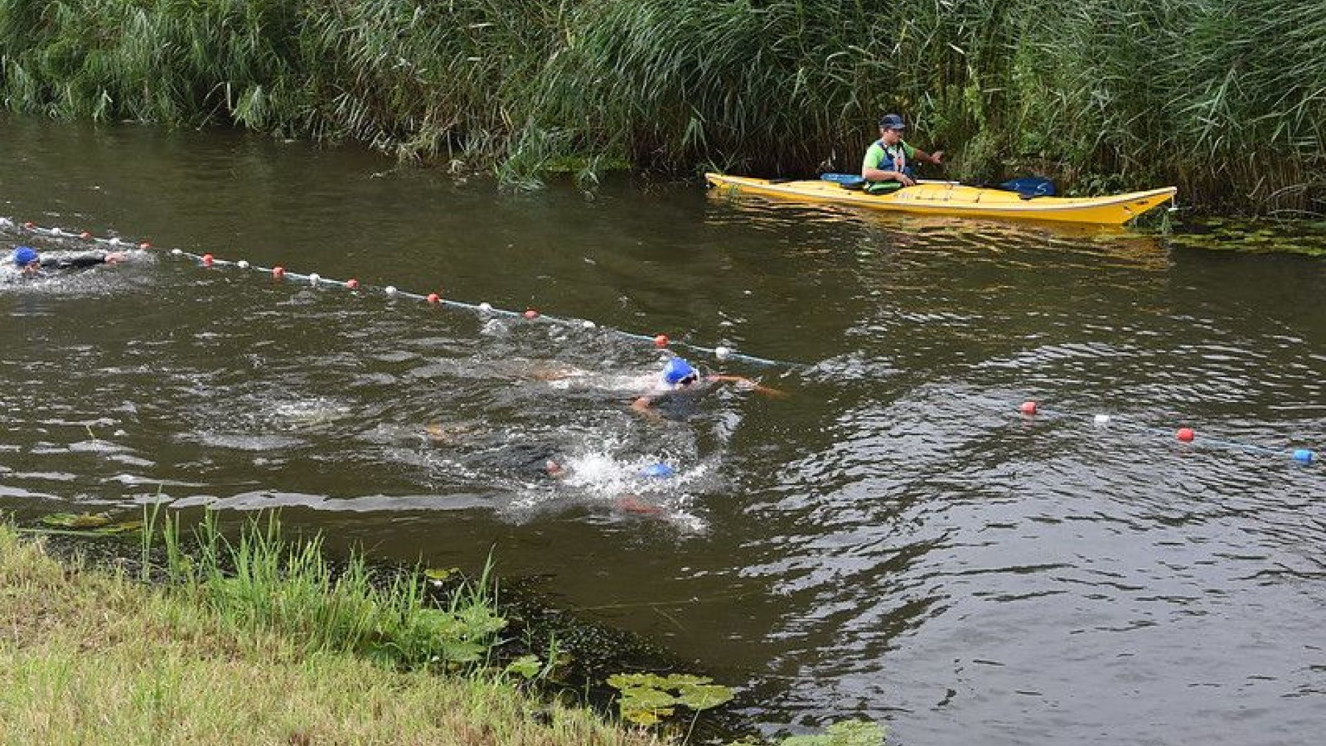 Het zwemparcours van de Prins Petfoods Triathlon Veenendaal was in 2021 uitgezet in de Grift