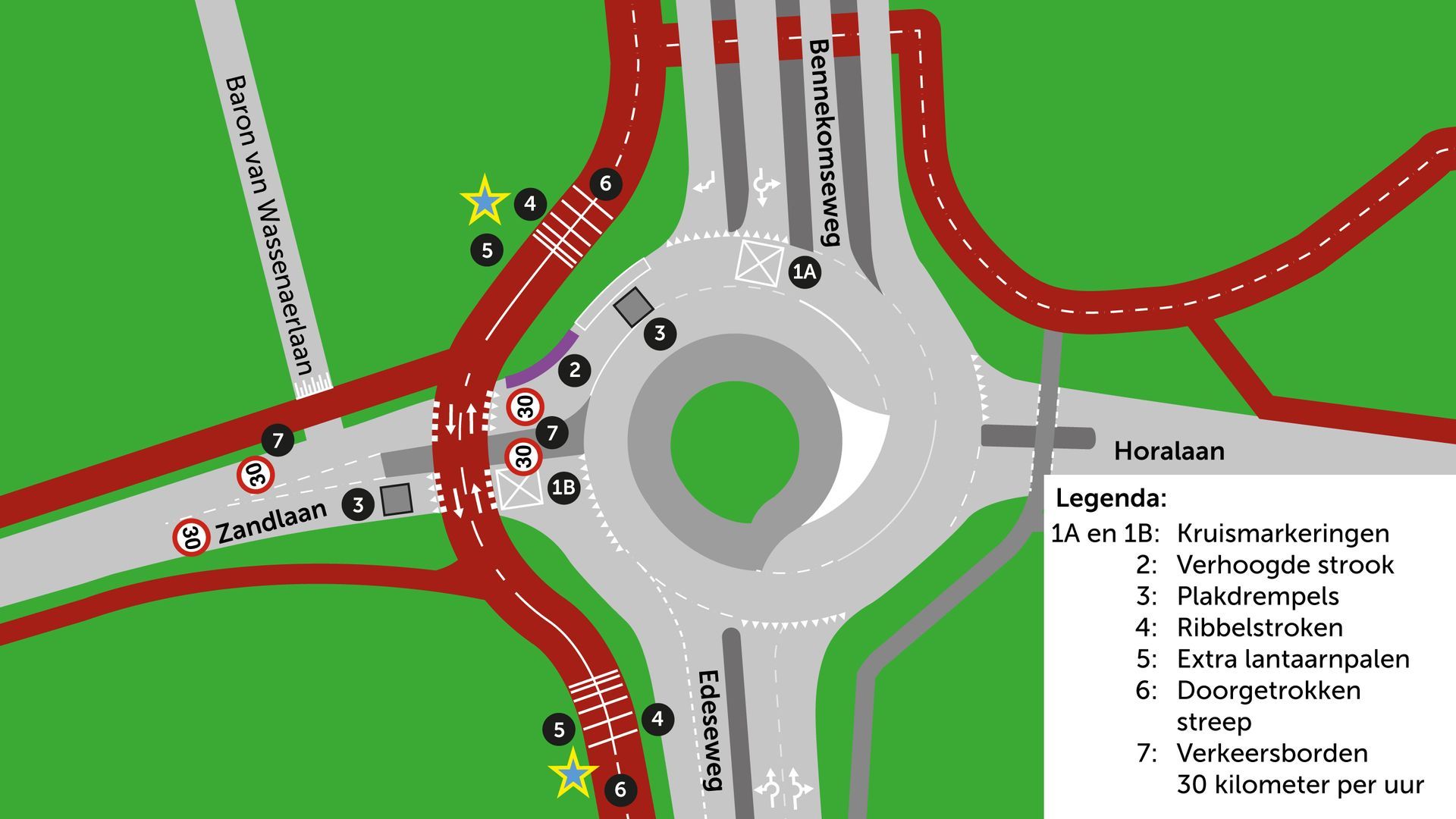 Volgens het college is er in de gemeente niet zozeer sprake van grote ‘black spots’ (ongevallenconcentraties op specifieke locaties), maar valt de rotonde op de Zandlaan-Bennekomseweg wel op in negatieve zin met 9 (gemelde) fietsongevallen in 2024. Die stijging was de directe aanleiding om daar snel een aantal extra maatregelen te treffen. Voor deze rotonde wordt momenteel nog onderzocht of er aanvullende grotere maatregelen nodig zijn om de verkeersveiligheid definitief te verbeteren. Hoe ver dat onderzoek is, is nog niet duidelijk, hoewel de voorspelling eind 2024 was dat een definitieve oplossing, op wat snel te realiseren aanpassingen na, nog jaren kan duren.