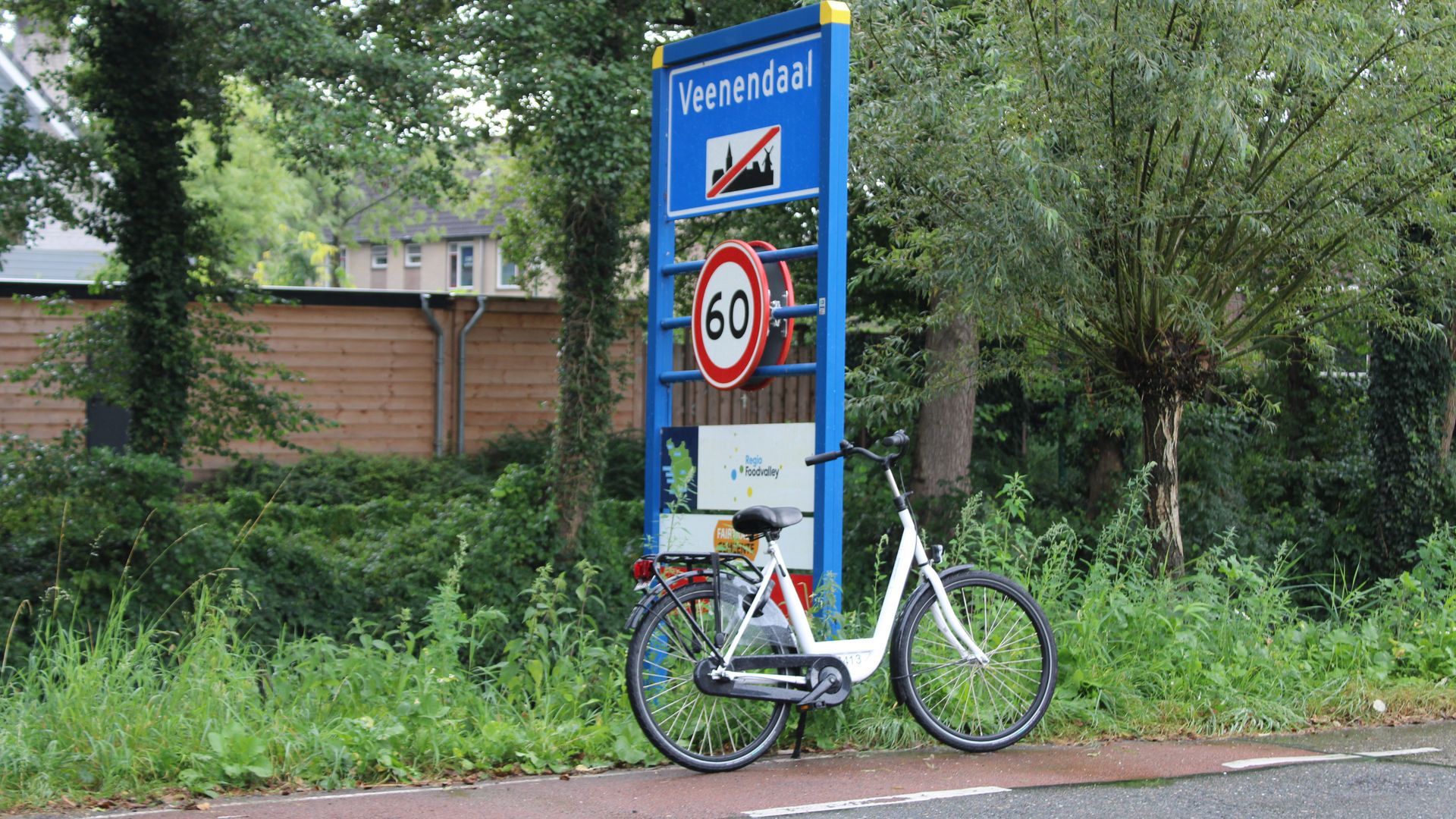 De natte fiets geparkeerd bij het gemeentebord