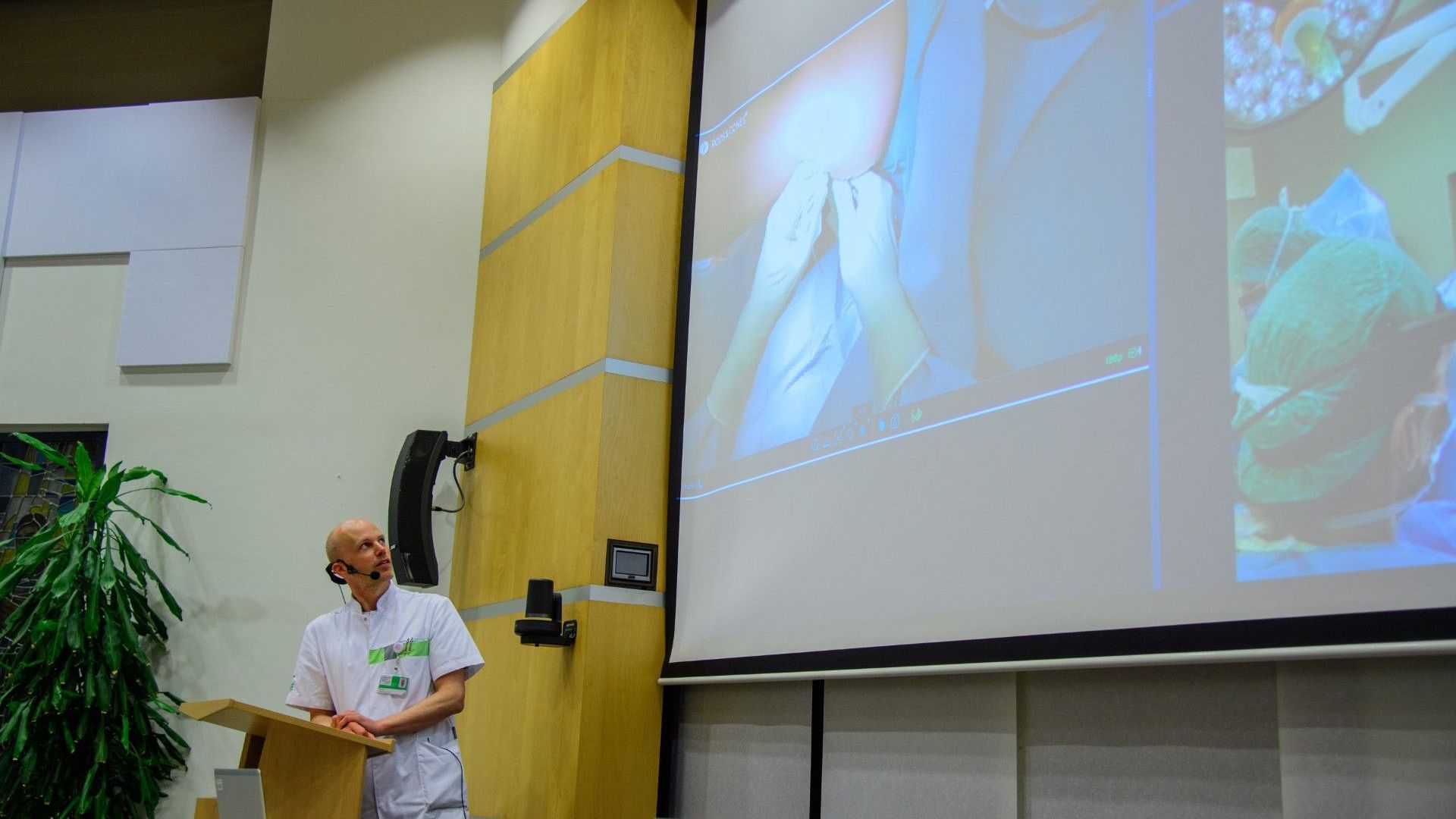 De operatie van een knie die meermaals uit de kom schiet, ook wel recidiverende patellaluxatie genoemd, werd op een groot scherm uitgezonden in het ziekenhuis. De operatie werd uitgevoerd door orthopedisch chirurg Wybren van der Wal. Chirurg Johan Pot gaf uitleg en gaf antwoord op vragen van de fysiotherapeuten.