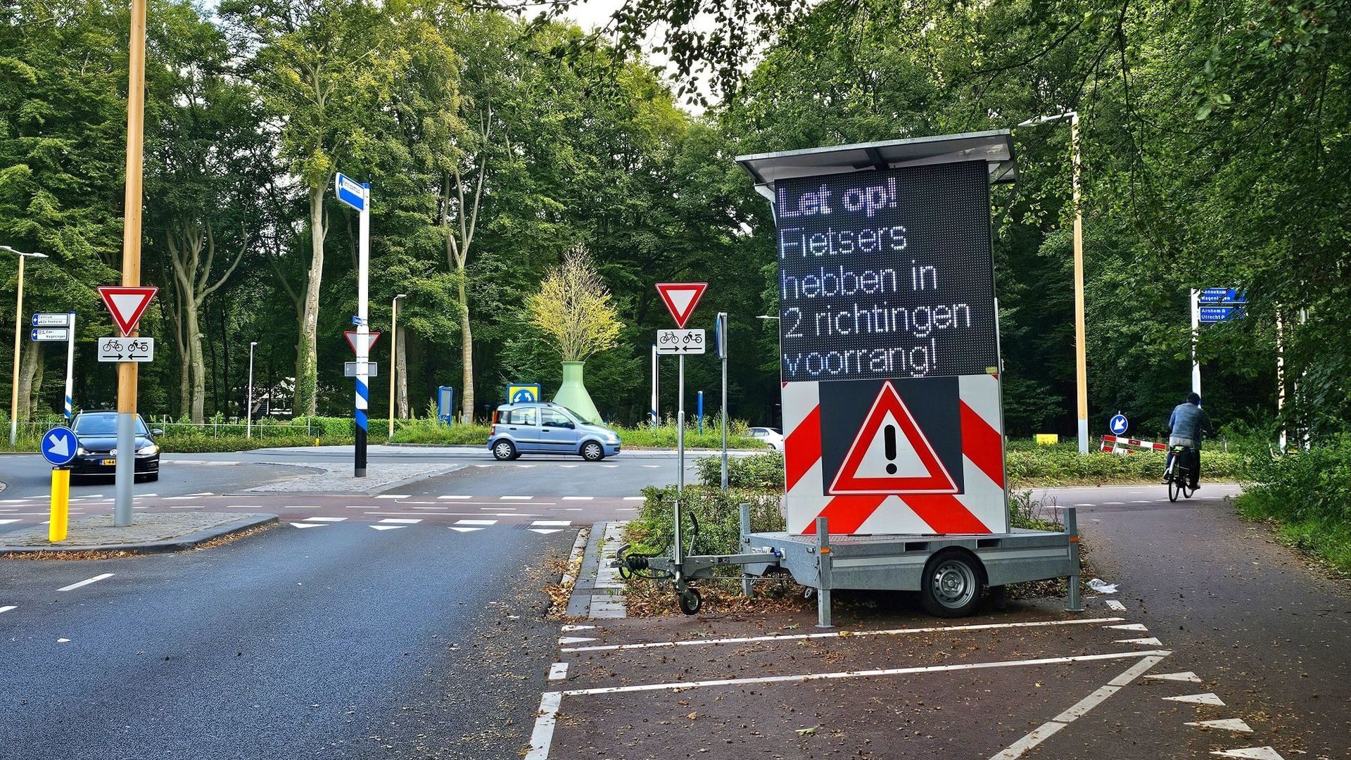 ‘Let op! Fietsers hebben in 2 richtingen voorrang!’, staat op het matrixbord (vanuit de Zandstraat) voor de rotonde.