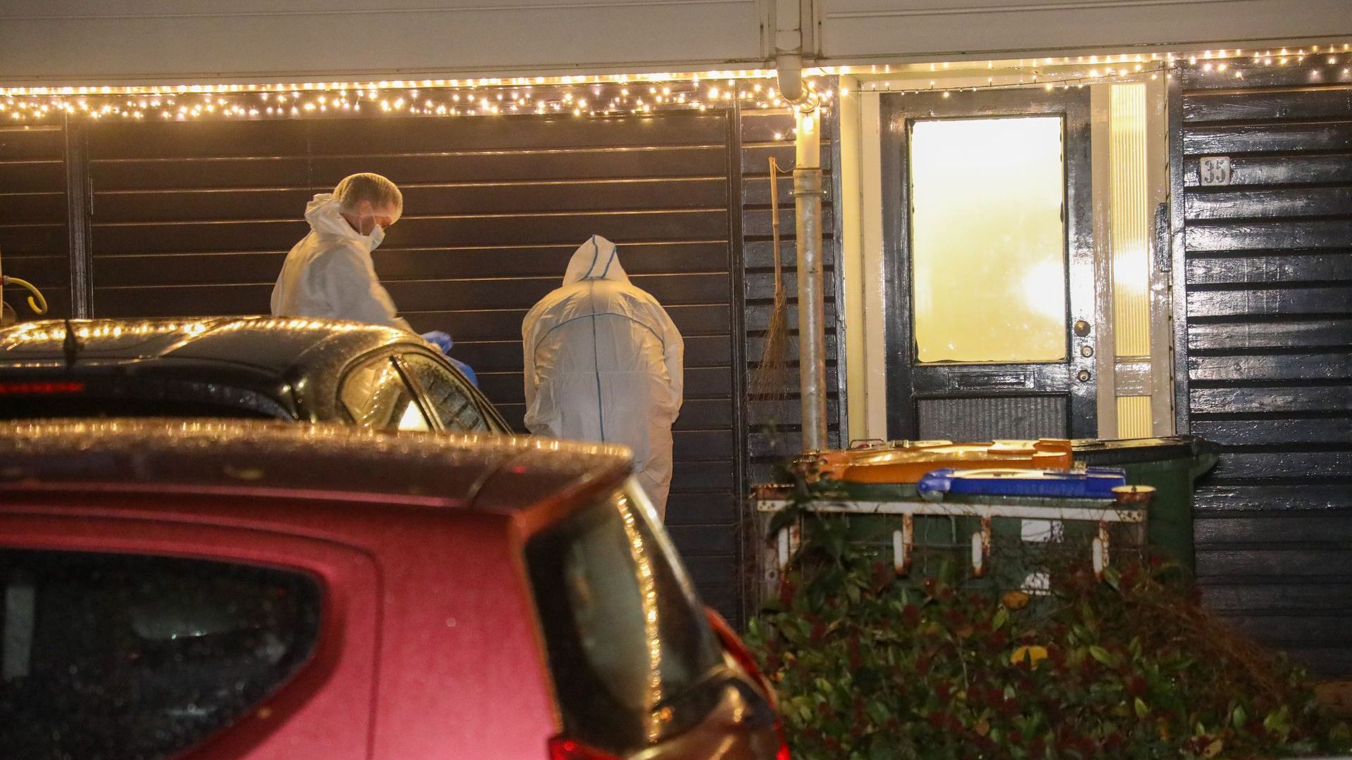Forensische rechercheurs in witte pakken hebben ter plaatse onderzoek gedaan. Twee mannen die ook in de woning waren zijn met papieren zakken om de armen meegenomen naar het bureau voor onderzoek.