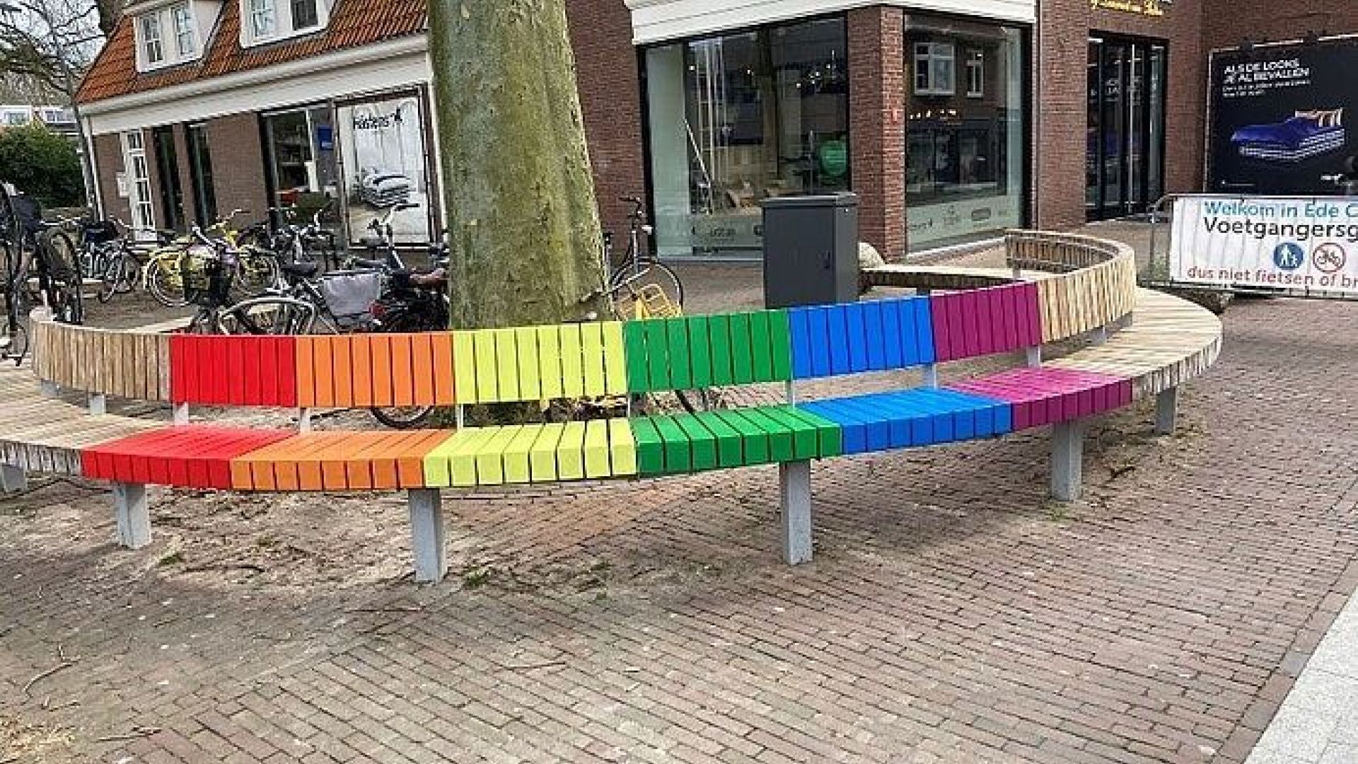 Regenboogbankje Ede centrum in één week tijd twee keer beklad