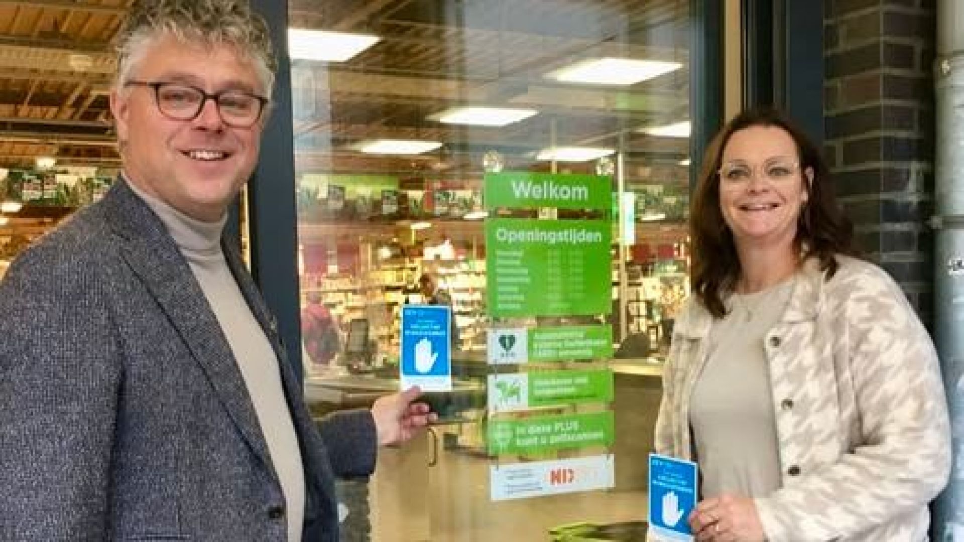 In aanwezigheid van wethouder Arnold Versteeg ging maandag het het collectief winkelverbod van start. Edwin en Astrid Holtrop bevestigden vanmiddag de eerste deelnamesticker bij de ingang van de PLUS.