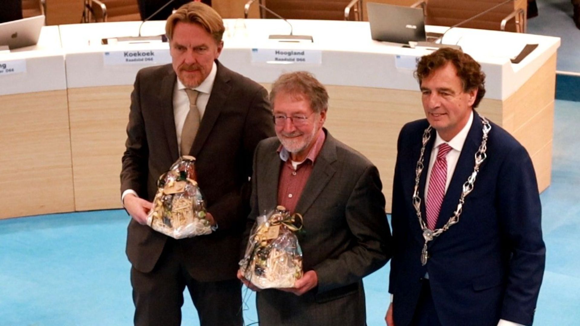 Henk Kohsiek (midden) van D66 Ede tijdens zijn beëdiging als raadslid in november 2025