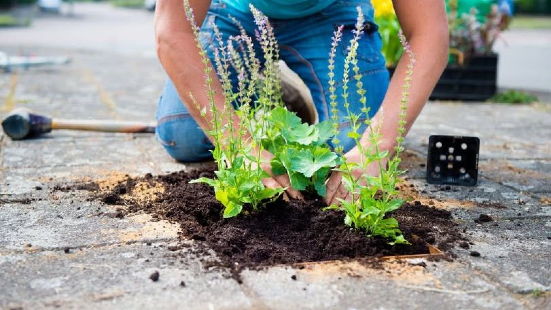 Inwoners kunnen een stukje stoep aan voor hun woning aanmelden. De gemeente haalt vervolgens twee of vier grote of kleine tegels weg, plaatst een stalen rand en levert goede aarde.