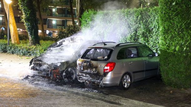 Op een parkeerplaats tussen de Hofbeeklaan en de Prinsenhof in Ede Veldhuizen zijn in een onrustig verlopen nacht van woensdag op donderdag twee auto’s uitgebrand.