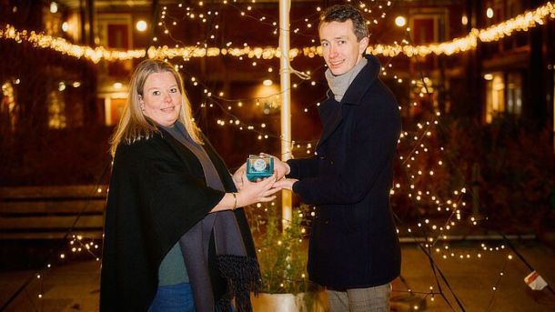 De Edese wethouder Jan Pieter van der Schans reikte dinsdagavond aan Monique Meijer de Jan Hilgerspenning uit. Dat gebeude tijdens het ontsteken van de kerstverlichting in de binnentuin van het seniorencomplex ‘De Zuiderkroon’.