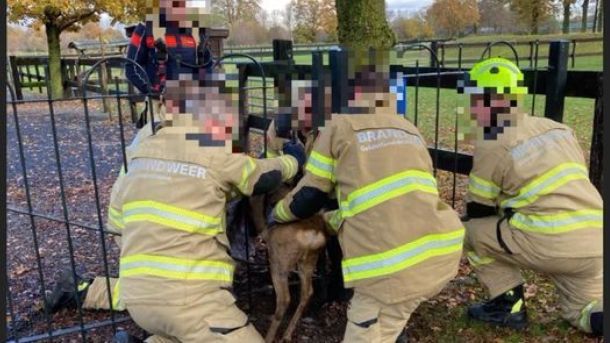 Een ree heeft een penibele situatie tussen de spijlen van een tuinhek in Ede niet overleefd. Bezorgde melders belden de Dierenambulance dat het beestje vastzat. Die schoot meteen te hulp, maar het ree zat met zijn heupen klemvast tussen de spijlen.
