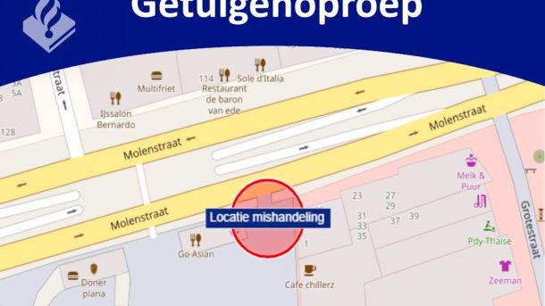 Op dinsdag 19 november 2024 omstreeks 15:30 uur heeft er op de Molenstraat/Markt in Ede een mishandeling plaatsgevonden. Bij de mishandeling is het slachtoffer gewond geraakt. De politie Ede is op zoek naar getuigen van deze mishandeling.