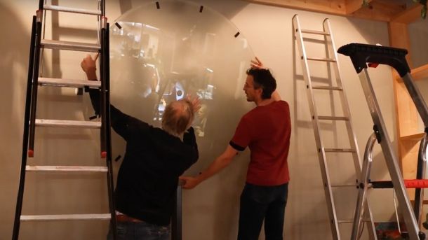 Tijdens het Repair Cafe in Ede is de grote glazen klok van de ENKA-kantine weer in werking gesteld.