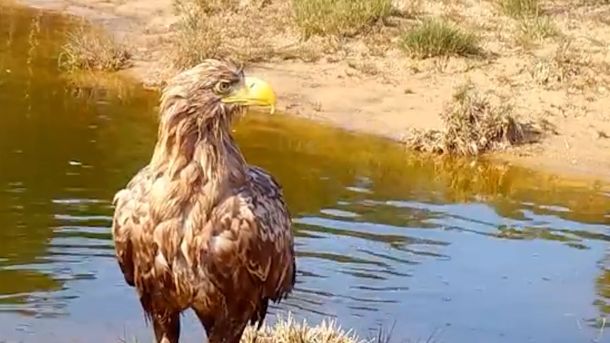 Boswachter Frank had een zeearend voor zijn wildcamera op de Zuidwest-Veluwe. Het dier poetst zichzelf en besluit een bad te nemen in een waterpoel