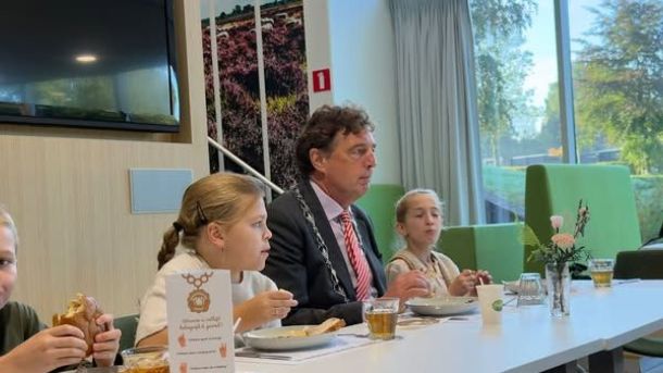 Groep 7 van de Lunterse basisschool De Wegwijzer ontbeet vanochtend met burgemeester René Verhulst van de gemeente Ede tijdens het Burgemeestersontbijt.