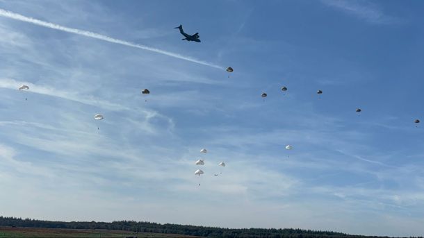 Vijf parachutisten raakten tijdens de defensie-oefening Falcon Leap na hun sprong uit het vliegtuig verstrikt in een boom. De brandweer moest ze uit de boom bevrijden.