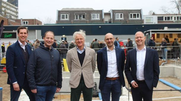 Na een periode van sloopwerkzaamheden en het aanbrengen van de fundering is op vrijdag 28 maart de start bouw van het appartementencomplex aan de Tuinstraat 4 feestelijk gevierd. Wethouder Engbert Stroobosscher legde samen met Sander Loosman (Reshape Properties), Frank van Woerden (KUDO) en enkele toekomstige bewoners symbolisch de eerste steen.