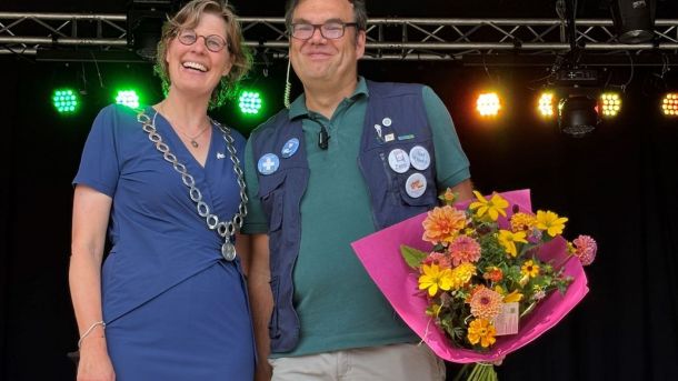 Sjef Moling neemt na 25 jaar afscheid van de Algemene Introductiedagen (AID) van de Wageningen University en kreeg daarom tijdens de opening van de AID van dit jaar het Wagenings Erezilver uit handen van locoburgemeester Maud Hulshof.
