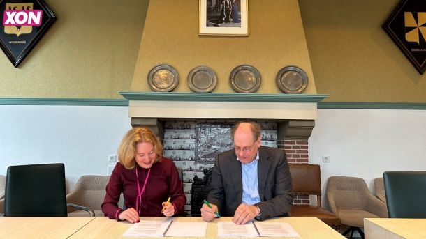 Wethouder Moniek van de Graaf en directeur-bestuurder van Omnia Wonen, Peter Toonen, hebben een koopovereenkomst ondertekend voor de bouw van tien sociale huurwoningen bij de Zegheweg.